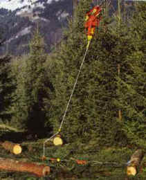 Motorseilkran mit Funksteuerung max. Hubkraft von 2'500 kg im Direktzug und 5'000 kg bei 2-fachem Zug. Mit Nachlaufwagen und Transportbalken 2- oder 4-rollig (Länge 3,5 m oder nach Belieben). 2-rollig (2-facher Zug) 5'000 kg Hubkraft, 4-rollig (4-facher Zug) 8'000 kg Hubkraft. Hubgeschwindigkeit im Direktzug 0 bis 2 m/S. Deutz Dieselmotor 25 kW/34PS. Die Hubräder werden hydraulisch angetrieben und in der Haltestellung durch zwei Lamellenbremsen gebremst. Zugseil ø 12 mm 6X19 mit Stahlseele verdichtet. Seilaufnahme 160 m. Die Hubräder haben nur eine Seillage und verhindern dadurch das Einschneiden bei Belastung und Hängenbleiben beim Abwinden. Die Hubgeschwindigkeit auf den Hubrädern ist konstant und verändert sich während dem Heben und Senken nicht. Mit Sicherung gegen das Abspringen vom Tragseil. Für WYSSEN Tragseilsättel 2,5 t und 5 t. Zugseiltragrollen am Tragseilsattel möglich. Tragseil ø bis 42 mm | ![]() |