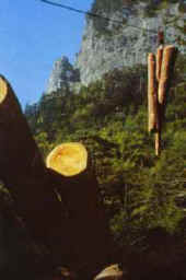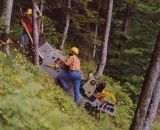 Mengen von Kehricht werden mit dem Seilkran gesammelt und aus dem Wald geräumt. |